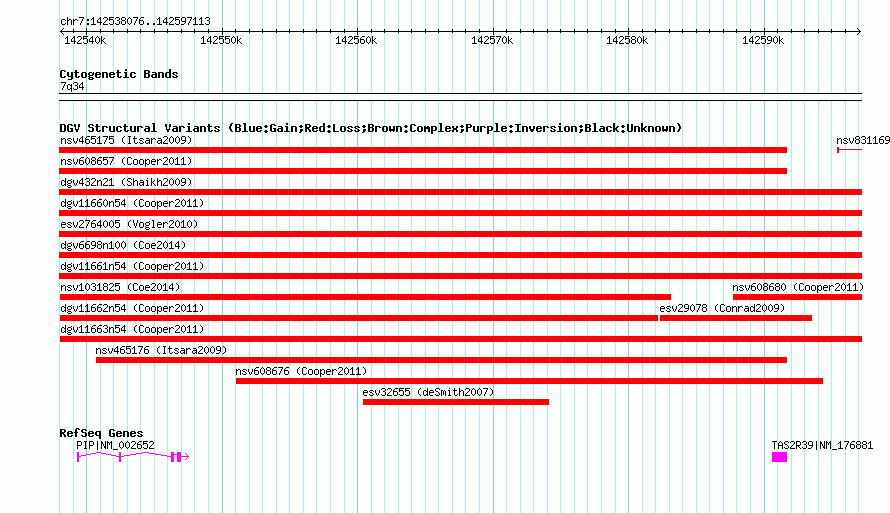 | | Variant Type | CNV loss | | Copy Number | | | Allele State | | | Allele Origin | | | Probe Count | | | Validation Flag | | | Merged Status | M | | Merged Variants | dgv6698n100 | | Supporting Variants | nssv3669504, nssv3759908, nssv3759909 | | Samples | | | Known Genes | PIP, TAS2R39 | | Method | SNP array | | Analysis | Affymetrix SNP array copy number analysis | | Platform | Affymetrix SNP Array 6.0 | | Comments | | | Reference | Coe_et_al_2014 | | Pubmed ID | 25217958 | | Accession Number(s) | nsv1031431