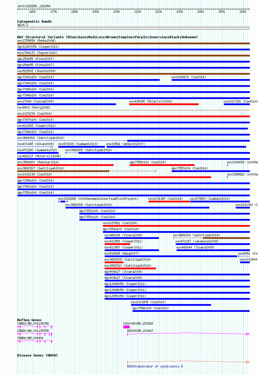 | | Variant Type | CNV gain | | Copy Number | | | Allele State | | | Allele Origin | | | Probe Count | | | Validation Flag | | | Merged Status | M | | Merged Variants | dgv7349n100 | | Supporting Variants | nssv3690968, nssv3690969, nssv3758059, nssv3690970 | | Samples | | | Known Genes | C9orf66, CBWD1, DOCK8 | | Method | SNP array | | Analysis | Affymetrix SNP array copy number analysis | | Platform | Affymetrix SNP Array 6.0 | | Comments | | | Reference | Coe_et_al_2014 | | Pubmed ID | 25217958 | | Accession Number(s) | nsv1031437
