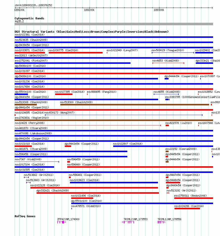 | Variant Type | CNV gain | Copy Number | | Allele State | | Allele Origin | | Probe Count | | Validation Flag | | Merged Status | M | Merged Variants | | Supporting Variants | nssv3636413 | Samples | | Known Genes | TRIML1, TRIML2, ZFP42 | Method | SNP array | Analysis | Affymetrix SNP array copy number analysis | Platform | Affymetrix SNP Array 6.0 | Comments | | Reference | Coe_et_al_2014 | Pubmed ID | 25217958 | Accession Number(s) | nsv1031595