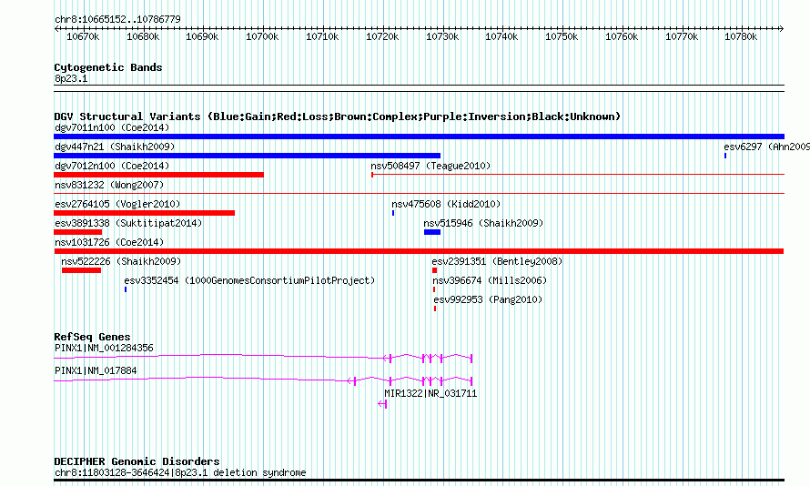 Variant DetailsVariant: nsv1031726| Internal ID | 19120948 | | Landmark | | | Location Information | | | Cytoband | 8p23.1 | | Allele length | | Assembly | Allele length | | hg38 | 121628 | | hg19 | 121628 | | hg18 | 121628 |