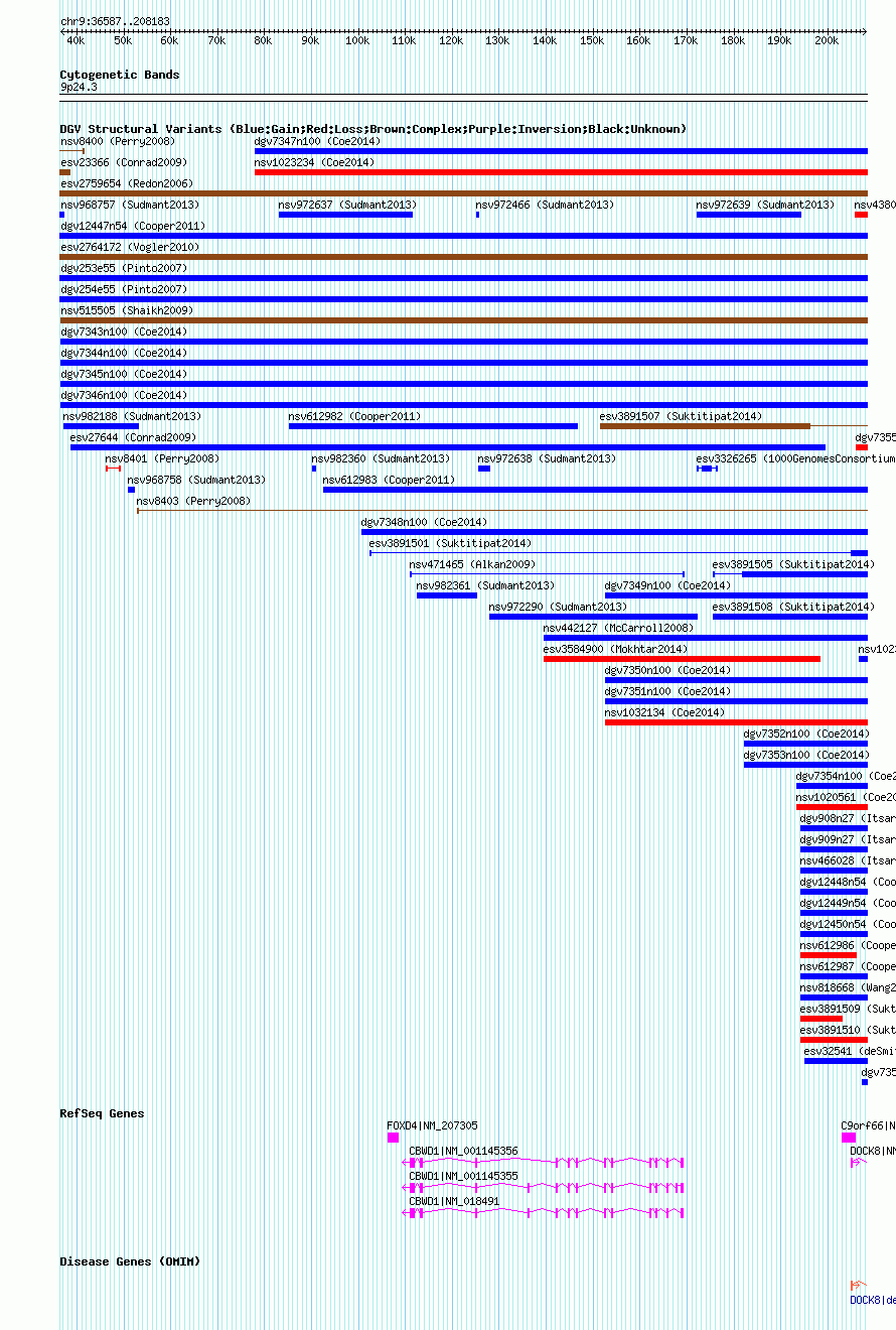 | | Variant Type | CNV gain | | Copy Number | | | Allele State | | | Allele Origin | | | Probe Count | | | Validation Flag | | | Merged Status | M | | Merged Variants | dgv7343n100 | | Supporting Variants | nssv3690935, nssv3690937, nssv3690938, nssv3690939, nssv3690936 | | Samples | | | Known Genes | C9orf66, CBWD1, DOCK8, FOXD4 | | Method | SNP array | | Analysis | Affymetrix SNP array copy number analysis | | Platform | Affymetrix SNP Array 6.0 | | Comments | | | Reference | Coe_et_al_2014 | | Pubmed ID | 25217958 | | Accession Number(s) | nsv1031865