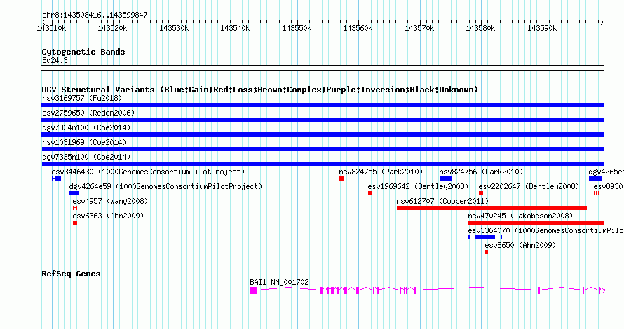 | | Variant Type | CNV gain | | Copy Number | | | Allele State | | | Allele Origin | | | Probe Count | | | Validation Flag | | | Merged Status | M | | Merged Variants | | | Supporting Variants | nssv3690094, nssv3690093 | | Samples | | | Known Genes | BAI1 | | Method | SNP array | | Analysis | Affymetrix SNP array copy number analysis | | Platform | Affymetrix SNP Array 6.0 | | Comments | | | Reference | Coe_et_al_2014 | | Pubmed ID | 25217958 | | Accession Number(s) | nsv1031969