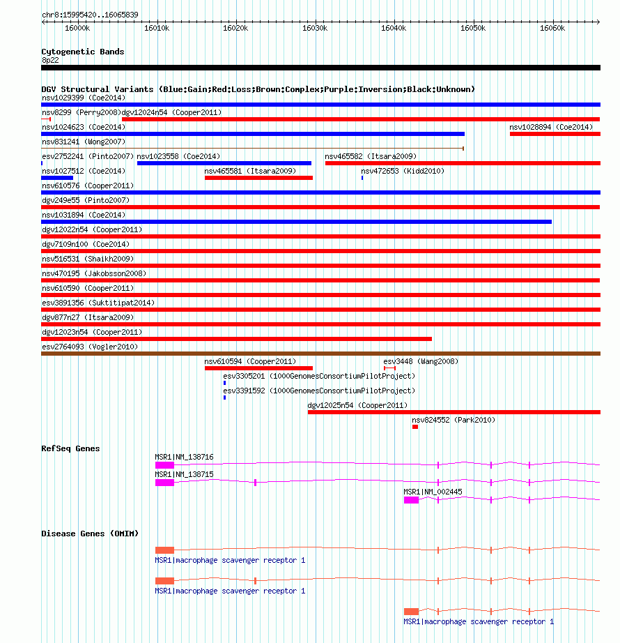 Variant DetailsVariant: nsv1032023| Internal ID | 19121245 | | Landmark | | | Location Information | | | Cytoband | 8p22 | | Allele length | | Assembly | Allele length | | hg38 | 70420 | | hg19 | 70420 | | hg18 | 70420 |