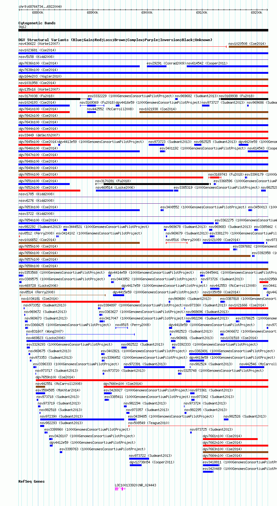 Variant DetailsVariant: nsv1032179| Internal ID | 19121401 | | Landmark | | | Location Information | | | Cytoband | 9q12 | | Allele length | | Assembly | Allele length | | hg38 | 455307 | | hg19 | 455307 | | hg18 | 455307 |