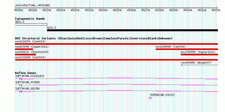 | Variant Type | CNV loss | Copy Number | | Allele State | | Allele Origin | | Probe Count | | Validation Flag | | Merged Status | M | Merged Variants | | Supporting Variants | nssv3745480 | Samples | | Known Genes | MIR586, SUPT3H | Method | SNP array | Analysis | Affymetrix SNP array copy number analysis | Platform | Affymetrix SNP Array 6.0 | Comments | | Reference | Coe_et_al_2014 | Pubmed ID | 25217958 | Accession Number(s) | nsv1032906
