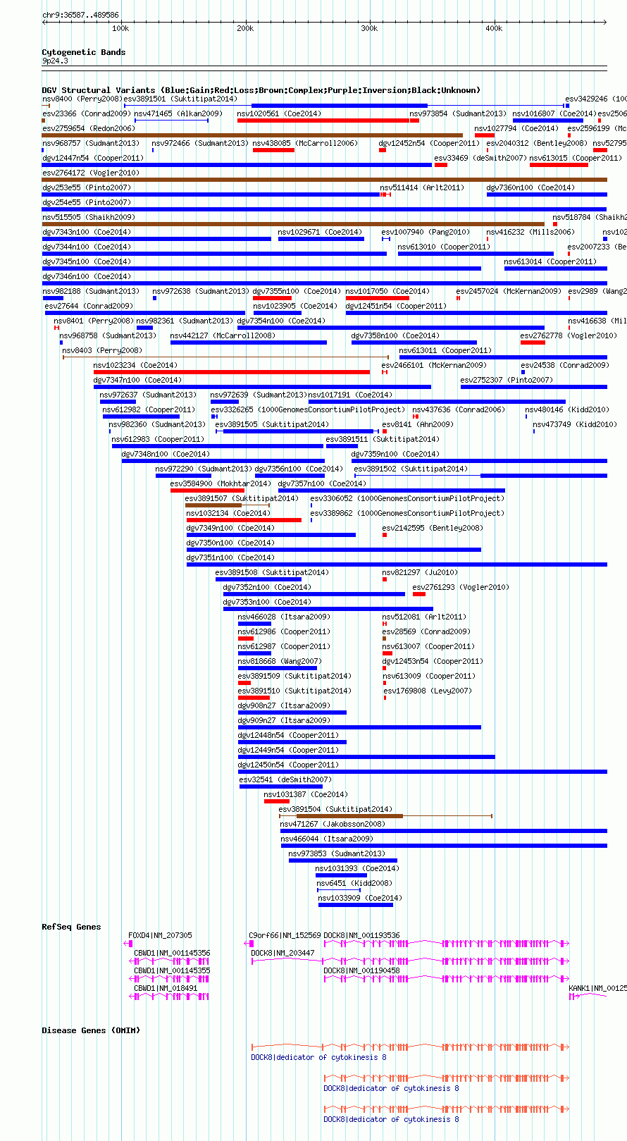 Variant DetailsVariant: nsv1033067| Internal ID | 19122289 | | Landmark | | | Location Information | | | Cytoband | 9p24.3 | | Allele length | | Assembly | Allele length | | hg38 | 453000 | | hg19 | 453000 | | hg18 | 453000 |