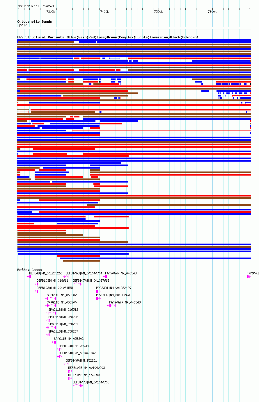 | | Variant Type | CNV gain | | Copy Number | | | Allele State | | | Allele Origin | | | Probe Count | | | Validation Flag | | | Merged Status | M | | Merged Variants | dgv6908n100 | | Supporting Variants | nssv3679016 | | Samples | | | Known Genes | DEFB103A, DEFB103B, DEFB104A, DEFB104B, DEFB105A, DEFB105B, DEFB106A, DEFB106B, DEFB107A, DEFB107B, DEFB4B, FAM90A10P, FAM90A7P, PRR23D1, PRR23D2, SPAG11B | | Method | SNP array | | Analysis | Affymetrix SNP array copy number analysis | | Platform | Affymetrix SNP Array 6.0 | | Comments | | | Reference | Coe_et_al_2014 | | Pubmed ID | 25217958 | | Accession Number(s) | nsv1033171