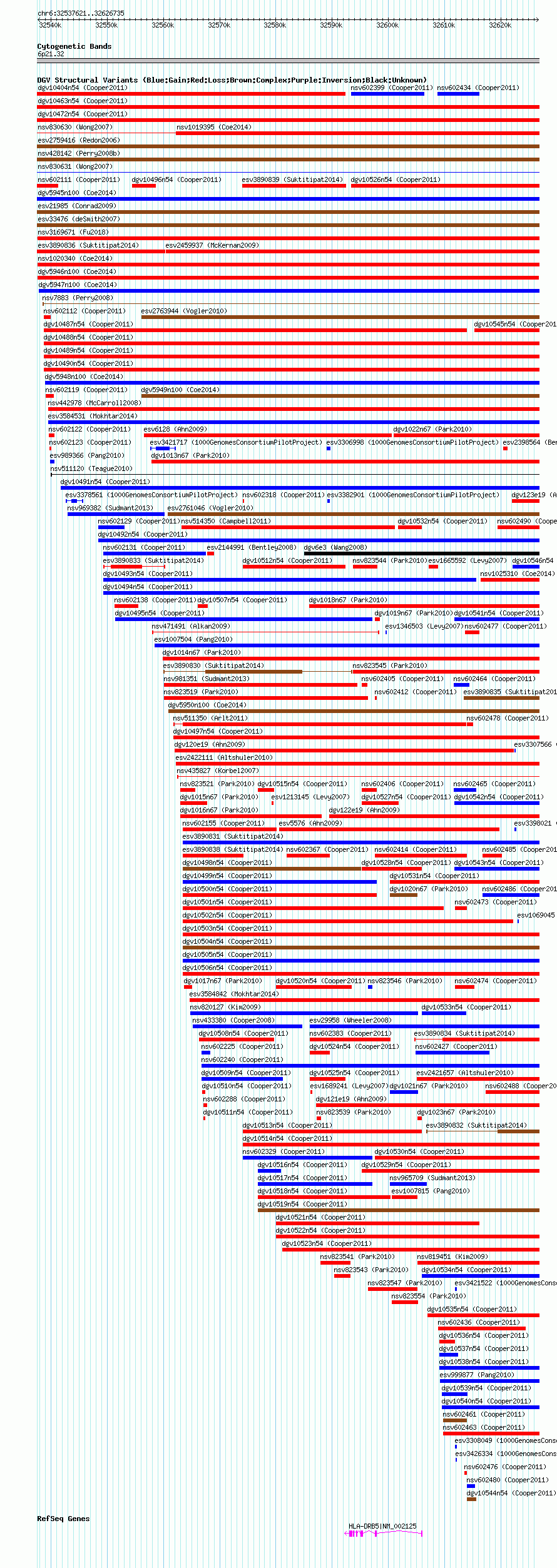 Variant DetailsVariant: nsv1033457| Internal ID | 19122678 | | Landmark | | | Location Information | | | Cytoband | 6p21.32 | | Allele length | | Assembly | Allele length | | hg38 | 89115 | | hg19 | 89115 | | hg18 | 89115 |