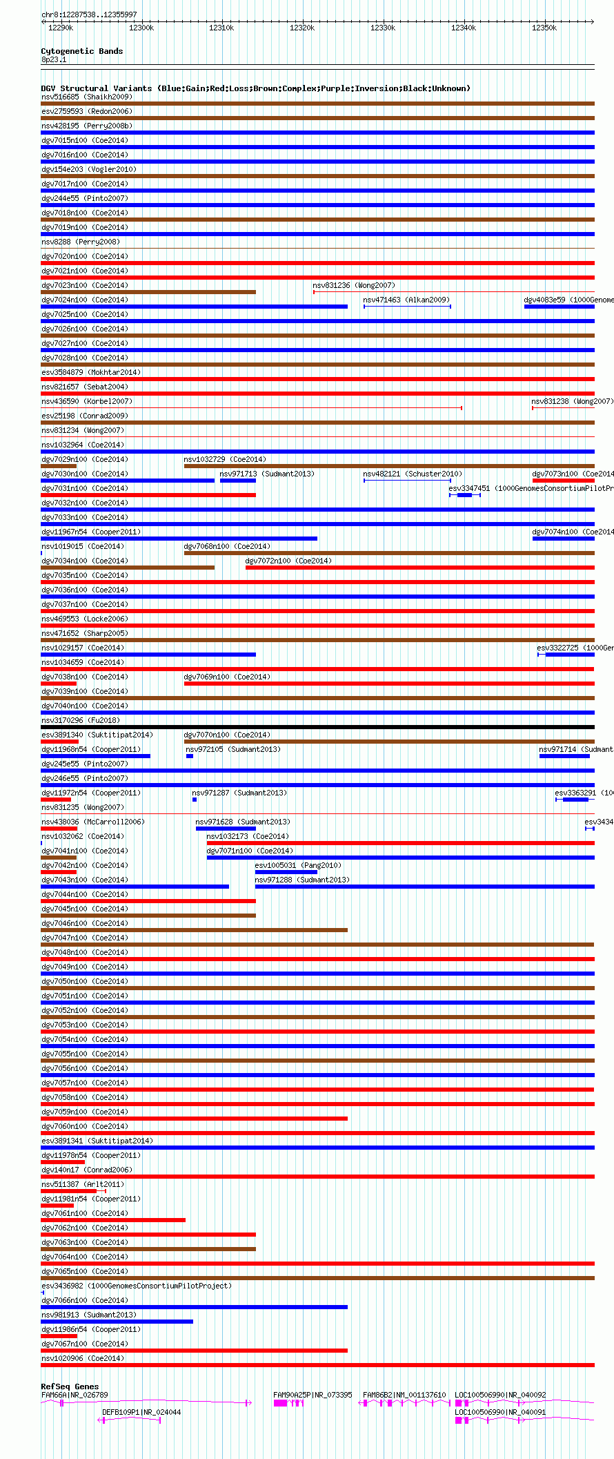 Variant DetailsVariant: nsv1033667| Internal ID | 19122888 | | Landmark | | | Location Information | | | Cytoband | 8p23.1 | | Allele length | | Assembly | Allele length | | hg38 | 68460 | | hg19 | 68460 | | hg18 | 68460 |