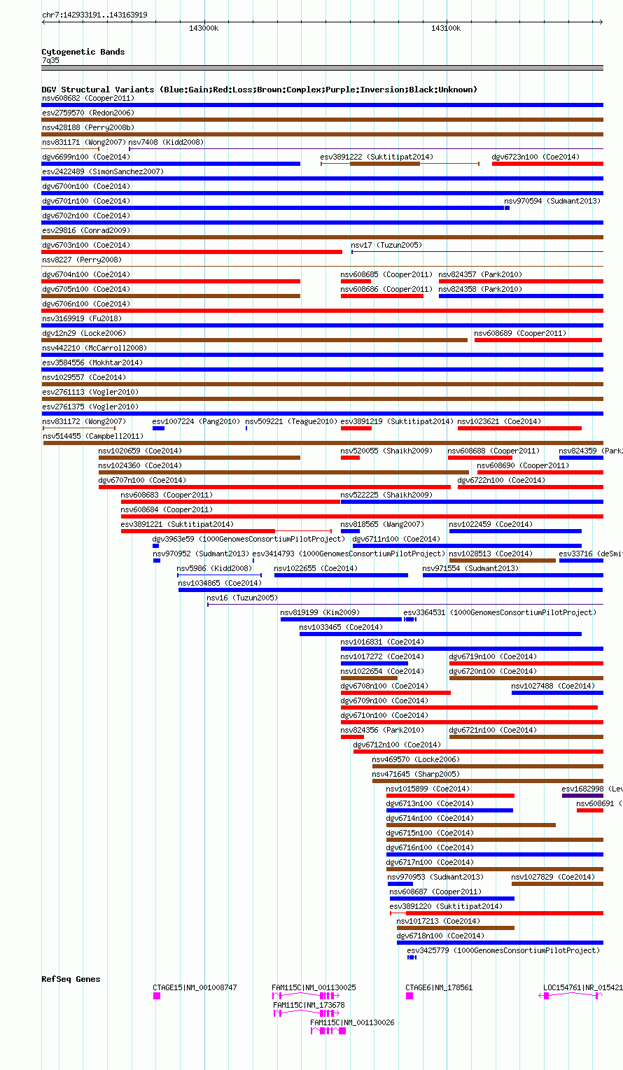 | | Variant Type | CNV gain | | Copy Number | | | Allele State | | | Allele Origin | | | Probe Count | | | Validation Flag | | | Merged Status | M | | Merged Variants | dgv6702n100 | | Supporting Variants | nssv3670272, nssv3670273, nssv3670280, nssv3670283, nssv3670282, nssv3670259, nssv3754731, nssv3670266, nssv3670260, nssv3670278, nssv3670264, nssv3670265, nssv3670269, nssv3670267, nssv3670258, nssv3670268, nssv3754727, nssv3670274, nssv3670270, nssv3670279, nssv3670277, nssv3754730, nssv3670275, nssv3670276, nssv3670263, nssv3670257, nssv3670281, nssv3754728, nssv3670262, nssv3670261, nssv3670271, nssv3754729 | | Samples | | | Known Genes | CTAGE15, CTAGE6, FAM115C, LOC154761 | | Method | SNP array | | Analysis | Affymetrix SNP array copy number analysis | | Platform | Affymetrix SNP Array 6.0 | | Comments | | | Reference | Coe_et_al_2014 | | Pubmed ID | 25217958 | | Accession Number(s) | nsv1033726