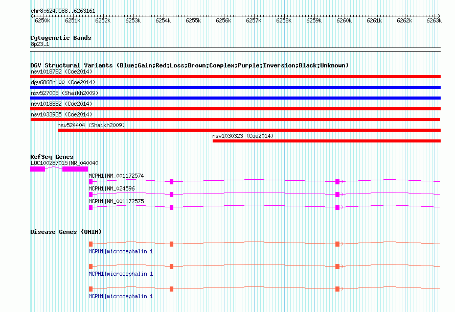 | | Variant Type | CNV loss | | Copy Number | | | Allele State | | | Allele Origin | | | Probe Count | | | Validation Flag | | | Merged Status | M | | Merged Variants | | | Supporting Variants | nssv3677426 | | Samples | | | Known Genes | LOC100287015, MCPH1 | | Method | SNP array | | Analysis | Affymetrix SNP array copy number analysis | | Platform | Affymetrix SNP Array 6.0 | | Comments | | | Reference | Coe_et_al_2014 | | Pubmed ID | 25217958 | | Accession Number(s) | nsv1033935