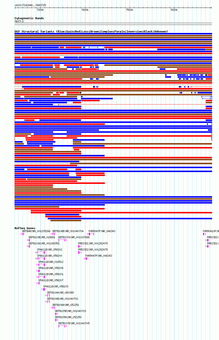 Variant DetailsVariant: nsv1034090| Internal ID | 19123312 | | Landmark | | | Location Information | | | Cytoband | 8p23.1 | | Allele length | | Assembly | Allele length | | hg38 | 391280 | | hg19 | 391280 | | hg18 | 441280 |