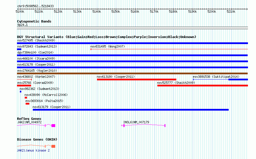 | | Variant Type | CNV gain | | Copy Number | | | Allele State | | | Allele Origin | | | Probe Count | | | Validation Flag | | | Merged Status | M | | Merged Variants | dgv7384n100 | | Supporting Variants | nssv3692413 | | Samples | | | Known Genes | INSL6, JAK2 | | Method | SNP array | | Analysis | Affymetrix SNP array copy number analysis | | Platform | Affymetrix SNP Array 6.0 | | Comments | | | Reference | Coe_et_al_2014 | | Pubmed ID | 25217958 | | Accession Number(s) | nsv1034221