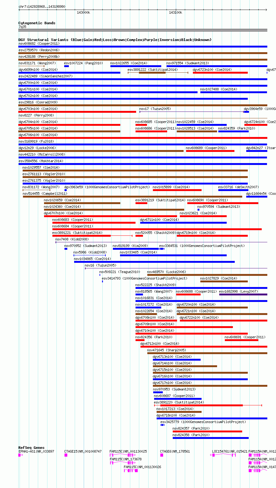 | | Variant Type | CNV gain | | Copy Number | | | Allele State | | | Allele Origin | | | Probe Count | | | Validation Flag | | | Merged Status | M | | Merged Variants | dgv6700n100 | | Supporting Variants | nssv3669759 | | Samples | | | Known Genes | CTAGE15, CTAGE6, EPHA1-AS1, FAM115A, FAM115C, LOC154761 | | Method | SNP array | | Analysis | Affymetrix SNP array copy number analysis | | Platform | Affymetrix SNP Array 6.0 | | Comments | | | Reference | Coe_et_al_2014 | | Pubmed ID | 25217958 | | Accession Number(s) | nsv1034371