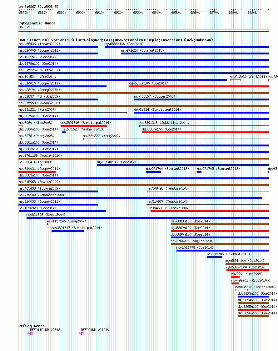 Variant DetailsVariant: nsv1034383| Internal ID | 19123605 | | Landmark | | | Location Information | | | Cytoband | 8p23.1 | | Allele length | | Assembly | Allele length | | hg38 | 131026 | | hg19 | 131026 | | hg18 | 131026 |
