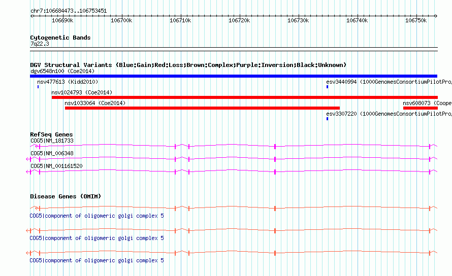 | | Variant Type | CNV gain | | Copy Number | | | Allele State | | | Allele Origin | | | Probe Count | | | Validation Flag | | | Merged Status | M | | Merged Variants | dgv6548n100 | | Supporting Variants | nssv3656216, nssv3656215 | | Samples | | | Known Genes | COG5 | | Method | SNP array | | Analysis | Affymetrix SNP array copy number analysis | | Platform | Affymetrix SNP Array 6.0 | | Comments | | | Reference | Coe_et_al_2014 | | Pubmed ID | 25217958 | | Accession Number(s) | nsv1034707