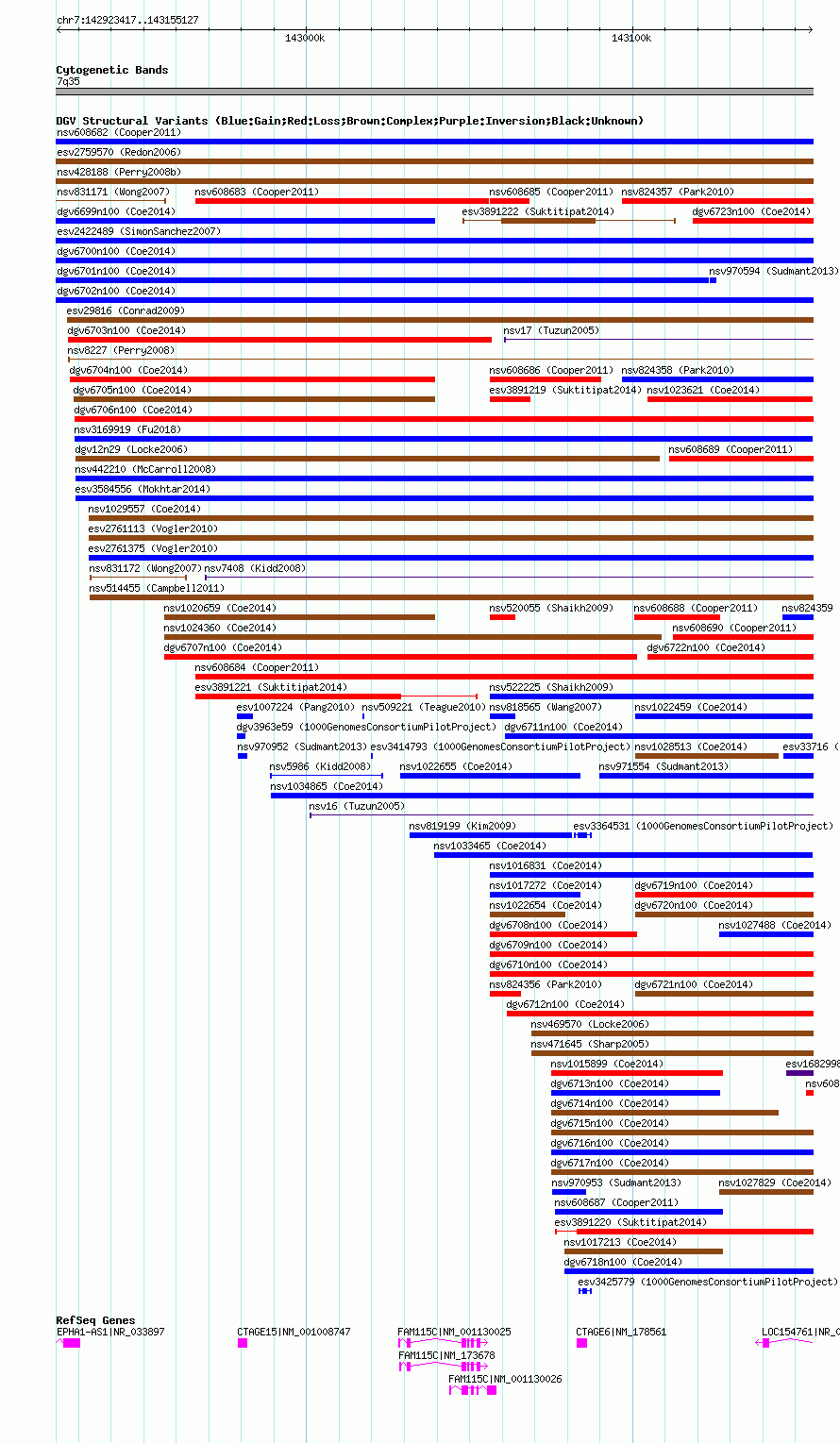 Variant DetailsVariant: nsv1034914| Internal ID | 19124134 | | Landmark | | | Location Information | | | Cytoband | 7q35 | | Allele length | | Assembly | Allele length | | hg38 | 310900 | | hg19 | 310900 | | hg18 | 231711 |
