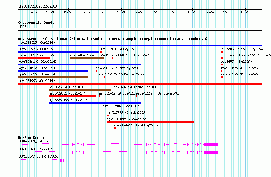 | Variant Type | CNV loss | Copy Number | | Allele State | | Allele Origin | | Probe Count | | Validation Flag | | Merged Status | M | Merged Variants | | Supporting Variants | nssv3675058 | Samples | | Known Genes | DLGAP2, LOC100507435 | Method | SNP array | Analysis | Affymetrix SNP array copy number analysis | Platform | Affymetrix SNP Array 6.0 | Comments | | Reference | Coe_et_al_2014 | Pubmed ID | 25217958 | Accession Number(s) | nsv1034963