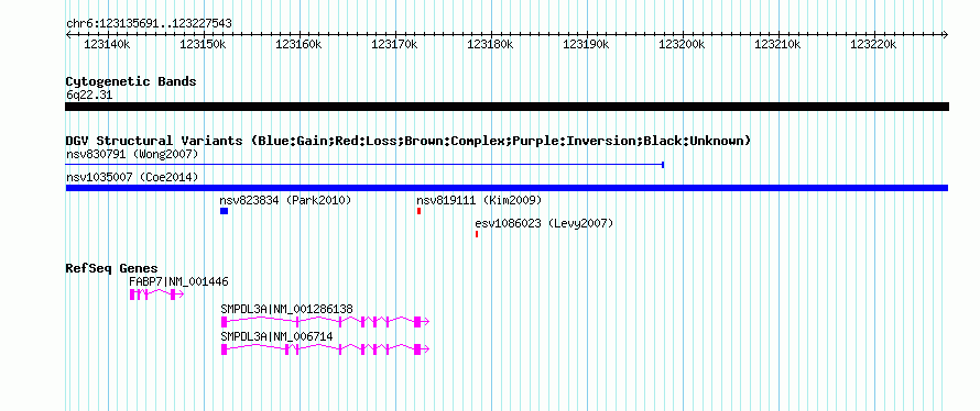 | | Variant Type | CNV gain | | Copy Number | | | Allele State | | | Allele Origin | | | Probe Count | | | Validation Flag | | | Merged Status | M | | Merged Variants | | | Supporting Variants | nssv3749522 | | Samples | | | Known Genes | FABP7, SMPDL3A | | Method | SNP array | | Analysis | Affymetrix SNP array copy number analysis | | Platform | Affymetrix SNP Array 6.0 | | Comments | | | Reference | Coe_et_al_2014 | | Pubmed ID | 25217958 | | Accession Number(s) | nsv1035007