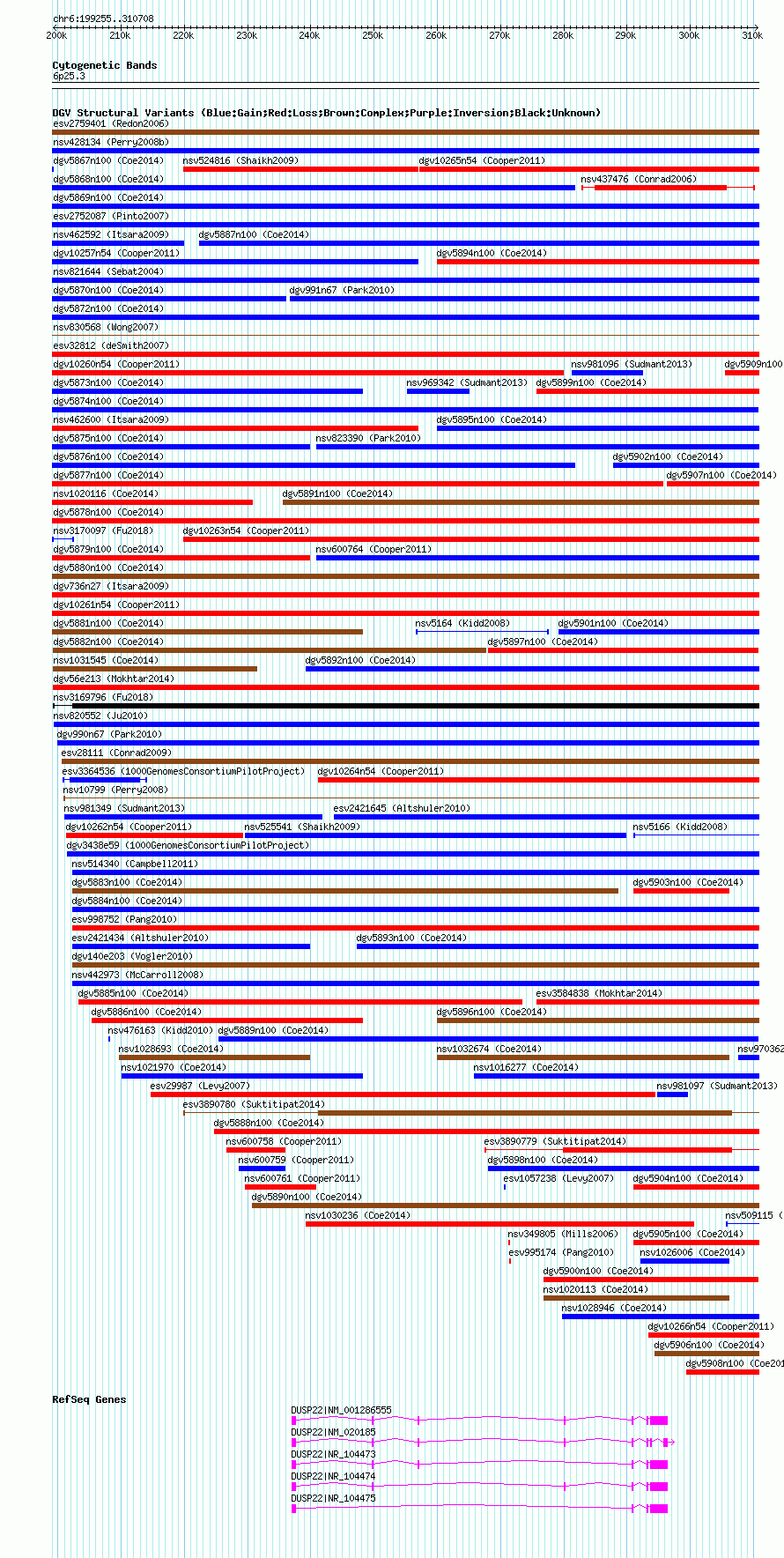 | | Variant Type | CNV loss | | Copy Number | | | Allele State | | | Allele Origin | | | Probe Count | | | Validation Flag | | | Merged Status | M | | Merged Variants | dgv5878n100 | | Supporting Variants | nssv3650443, nssv3650442 | | Samples | | | Known Genes | DUSP22 | | Method | SNP array | | Analysis | Affymetrix SNP array copy number analysis | | Platform | Affymetrix SNP Array 6.0 | | Comments | | | Reference | Coe_et_al_2014 | | Pubmed ID | 25217958 | | Accession Number(s) | nsv1035023