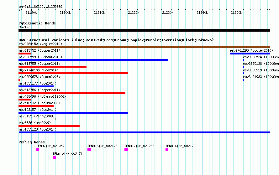 Variant DetailsVariant: nsv1035128| Internal ID | 19124347 | | Landmark | | | Location Information | | | Cytoband | 9p21.3 | | Allele length | | Assembly | Allele length | | hg38 | 73370 | | hg19 | 73370 | | hg18 | 73370 |