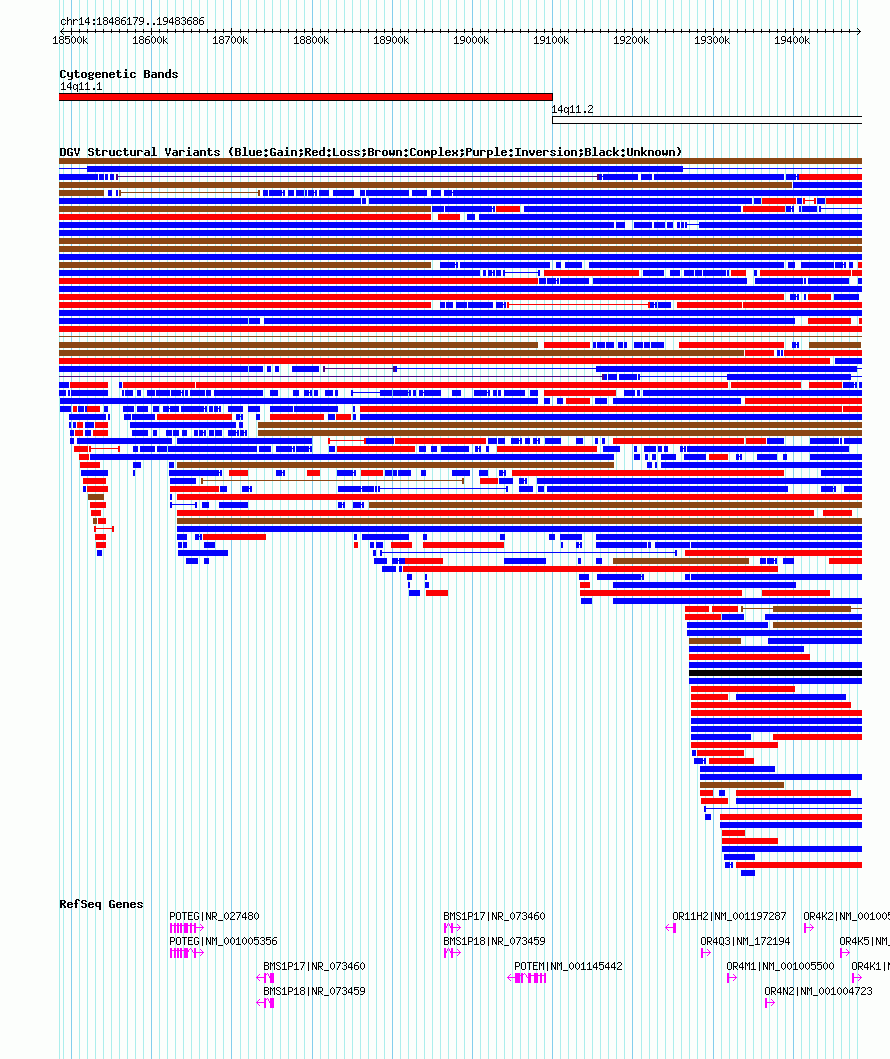 Variant DetailsVariant: nsv1035296| Internal ID | 19124515 | | Landmark | | | Location Information | | | Cytoband | 14q11.1 | | Allele length | | Assembly | Allele length | | hg38 | 1305986 | | hg19 | 997668 | | hg18 | 997508 |
