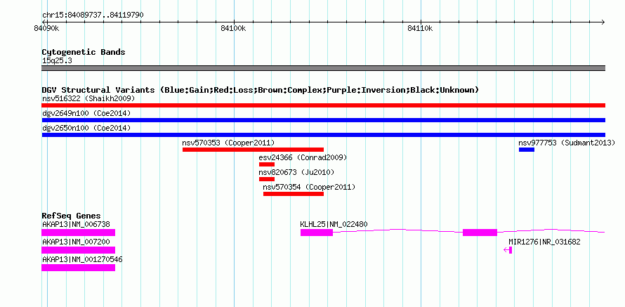 | | Variant Type | CNV gain | | Copy Number | | | Allele State | | | Allele Origin | | | Probe Count | | | Validation Flag | | | Merged Status | M | | Merged Variants | dgv2649n100 | | Supporting Variants | nssv3555080 | | Samples | | | Known Genes | AKAP13, KLHL25, MIR1276 | | Method | SNP array | | Analysis | Affymetrix SNP array copy number analysis | | Platform | Affymetrix SNP Array 6.0 | | Comments | | | Reference | Coe_et_al_2014 | | Pubmed ID | 25217958 | | Accession Number(s) | nsv1035336