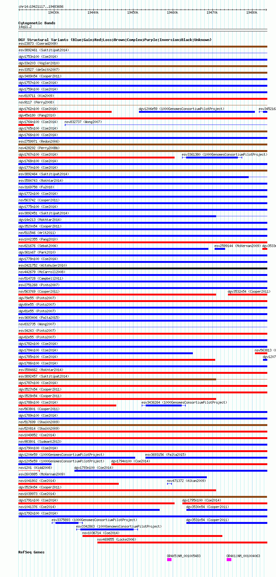 Variant DetailsVariant: nsv1035357| Internal ID | 19124576 | | Landmark | | | Location Information | | | Cytoband | 14q11.2 | | Allele length | | Assembly | Allele length | | hg38 | 62570 | | hg19 | 62570 | | hg18 | 62570 |