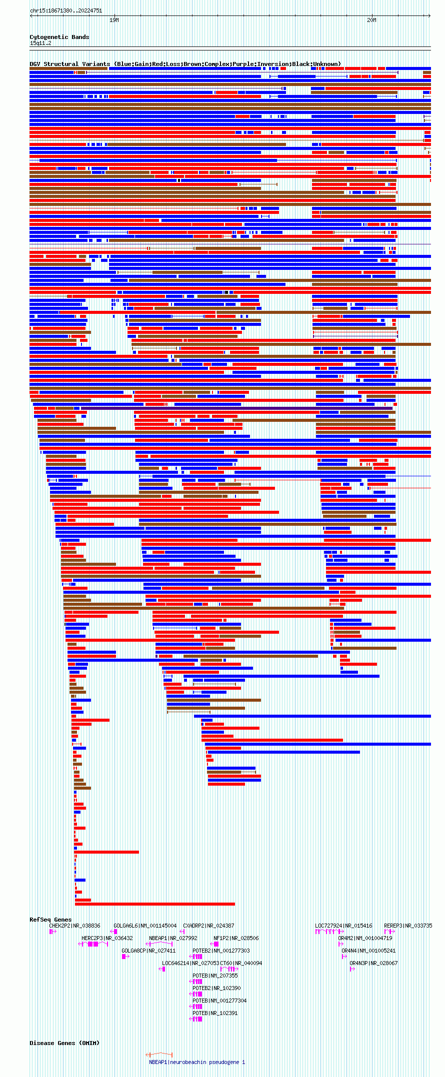 Variant DetailsVariant: nsv1035595| Internal ID | 19124814 | | Landmark | | | Location Information | | | Cytoband | 15q11.1 | | Allele length | | Assembly | Allele length | | hg38 | 2102130 | | hg19 | 2262022 | | hg18 | 1553372 |