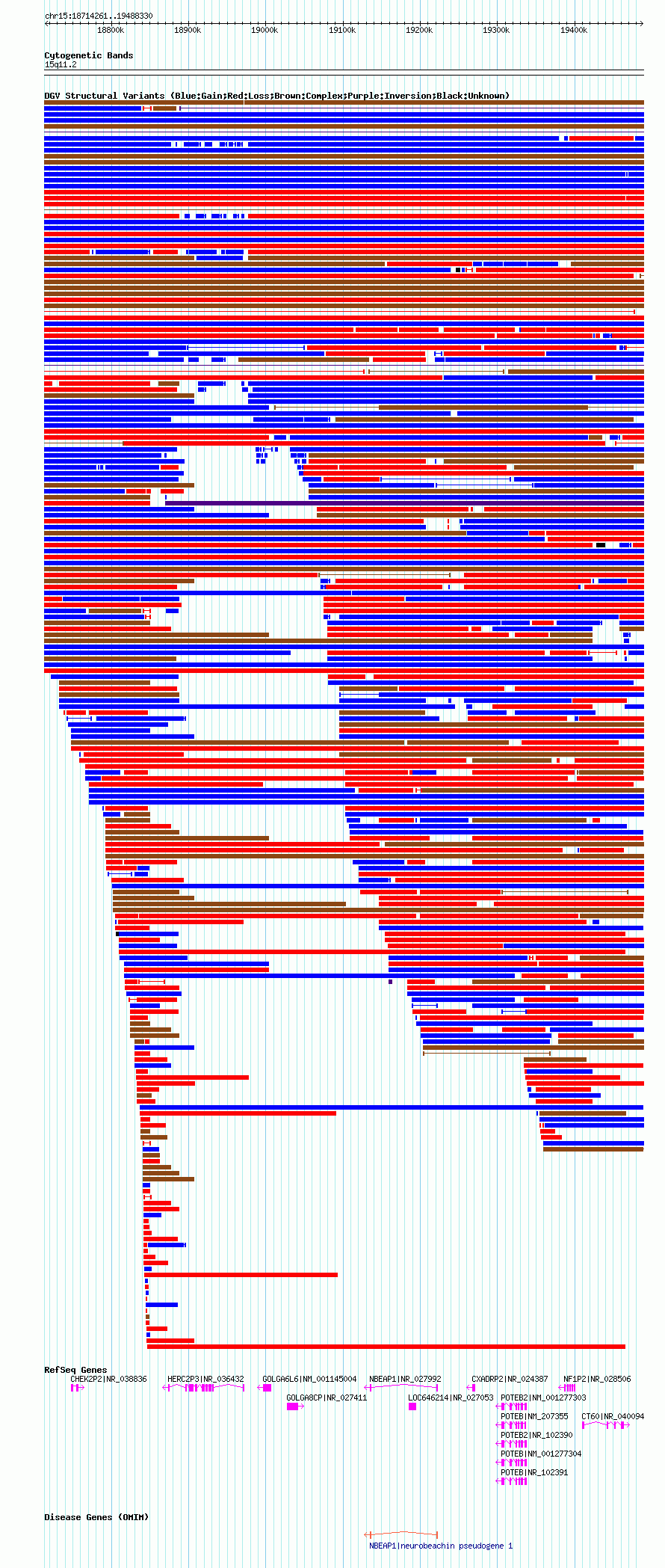 Variant DetailsVariant: nsv1035770| Internal ID | 19124989 | | Landmark | | | Location Information | | | Cytoband | 15q11.1 | | Allele length | | Assembly | Allele length | | hg38 | 769349 | | hg19 | 769425 | | hg18 | 774070 |