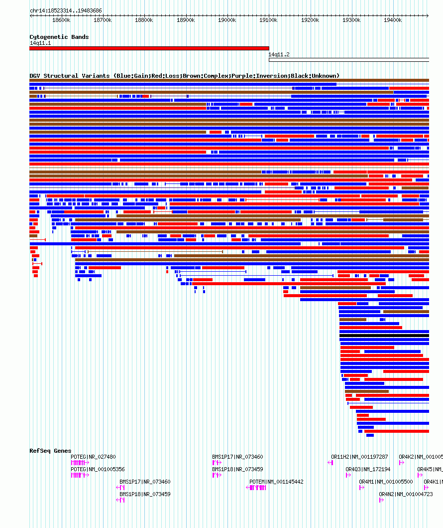 Variant DetailsVariant: nsv1035777| Internal ID | 19124996 | | Landmark | | | Location Information | | | Cytoband | 14q11.1 | | Allele length | | Assembly | Allele length | | hg38 | 1268851 | | hg19 | 960533 | | hg18 | 960373 |