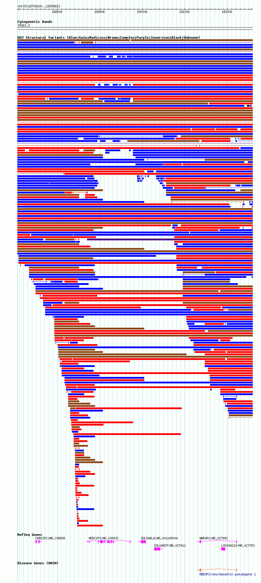 | | Variant Type | CNV gain+loss | | Copy Number | | | Allele State | | | Allele Origin | | | Probe Count | | | Validation Flag | | | Merged Status | M | | Merged Variants | dgv2209n100 | | Supporting Variants | nssv3534732, nssv3534731 | | Samples | | | Known Genes | CHEK2P2, GOLGA6L6, GOLGA8CP, HERC2P3, LOC646214, NBEAP1 | | Method | SNP array | | Analysis | Affymetrix SNP array copy number analysis | | Platform | Affymetrix SNP Array 6.0 | | Comments | | | Reference | Coe_et_al_2014 | | Pubmed ID | 25217958 | | Accession Number(s) | nsv1035802