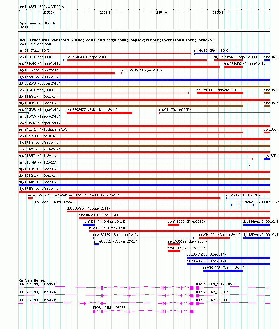 Variant DetailsVariant: nsv1036269| Internal ID | 19125488 | | Landmark | | | Location Information | | | Cytoband | 14q11.2 | | Allele length | | Assembly | Allele length | | hg38 | 44354 | | hg19 | 44354 | | hg18 | 44354 |