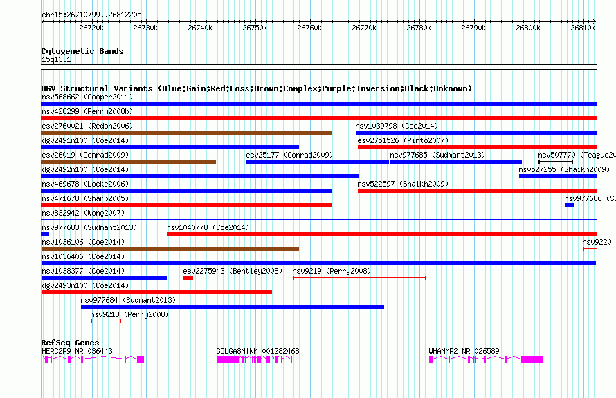 | | Variant Type | CNV gain | | Copy Number | | | Allele State | | | Allele Origin | | | Probe Count | | | Validation Flag | | | Merged Status | M | | Merged Variants | | | Supporting Variants | nssv3545673, nssv3721479 | | Samples | | | Known Genes | GOLGA8M, HERC2P9, WHAMMP2 | | Method | SNP array | | Analysis | Affymetrix SNP array copy number analysis | | Platform | Affymetrix SNP Array 6.0 | | Comments | | | Reference | Coe_et_al_2014 | | Pubmed ID | 25217958 | | Accession Number(s) | nsv1036406