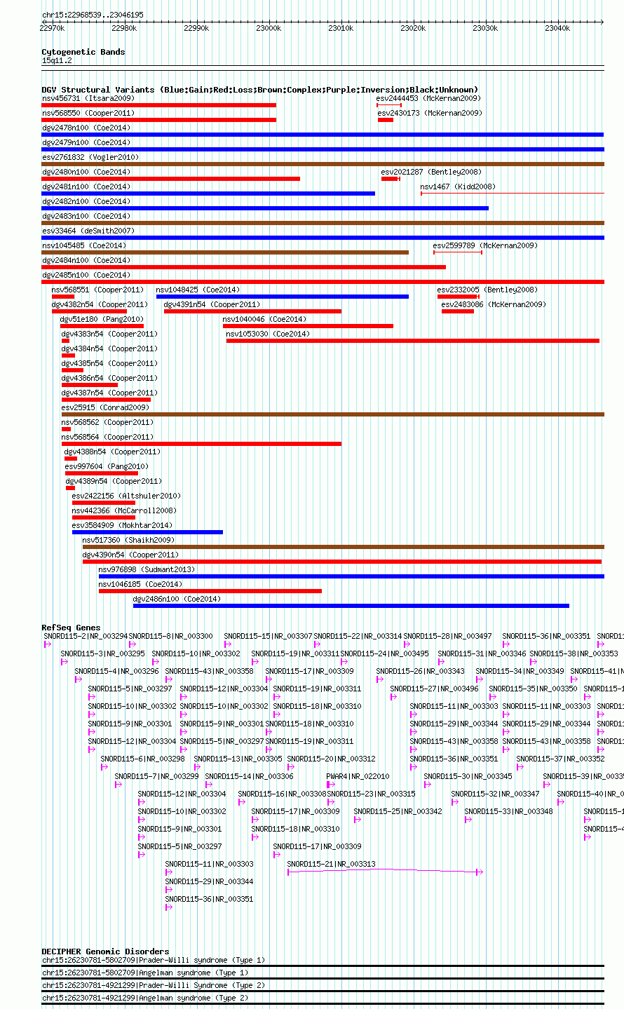 | | Variant Type | CNV gain+loss | | Copy Number | | | Allele State | | | Allele Origin | | | Probe Count | | | Validation Flag | | | Merged Status | M | | Merged Variants | dgv2483n100 | | Supporting Variants | nssv3545571, nssv3545570, nssv3545569 | | Samples | | | Known Genes | PWAR4, SNORD115-10, SNORD115-11, SNORD115-12, SNORD115-13, SNORD115-14, SNORD115-15, SNORD115-16, SNORD115-17, SNORD115-18, SNORD115-19, SNORD115-2, SNORD115-20, SNORD115-21, SNORD115-22, SNORD115-23, SNORD115-24, SNORD115-25, SNORD115-26, SNORD115-27, SNORD115-28, SNORD115-29, SNORD115-3, SNORD115-30, SNORD115-31, SNORD115-32, SNORD115-33, SNORD115-34, SNORD115-35, SNORD115-36, SNORD115-37, SNORD115-38, SNORD115-39, SNORD115-4, SNORD115-40, SNORD115-41, SNORD115-42, SNORD115-43, SNORD115-5, SNORD115-6, SNORD115-7, SNORD115-8, SNORD115-9 | | Method | SNP array | | Analysis | Affymetrix SNP array copy number analysis | | Platform | Affymetrix SNP Array 6.0 | | Comments | | | Reference | Coe_et_al_2014 | | Pubmed ID | 25217958 | | Accession Number(s) | nsv1036459