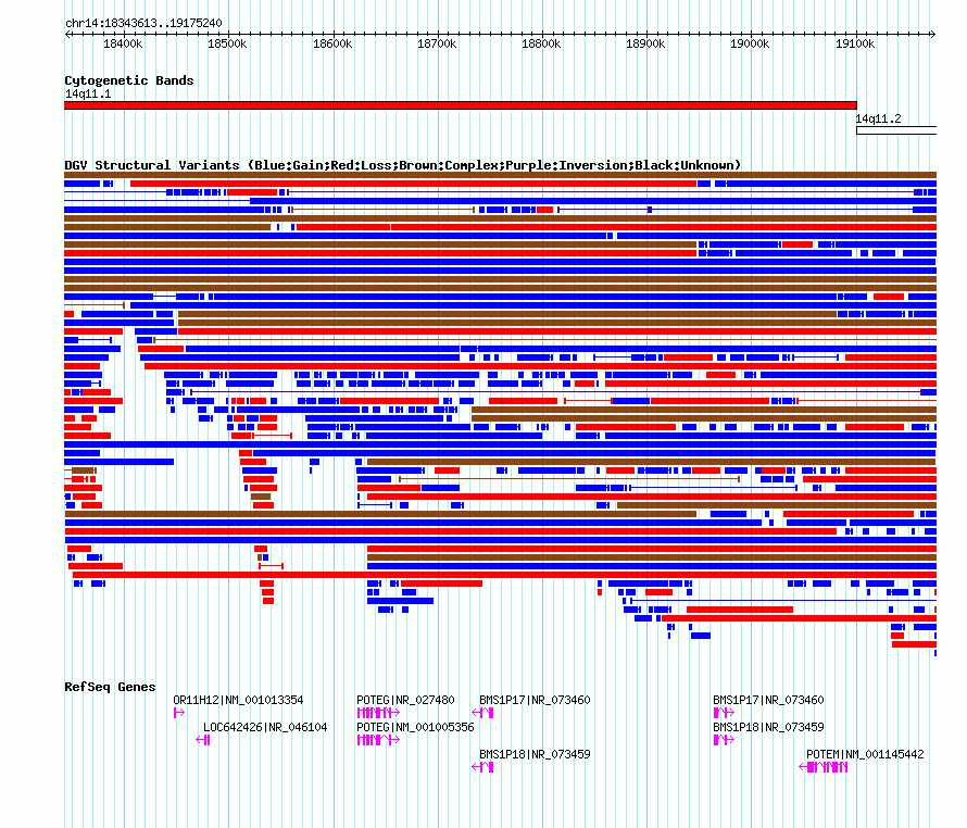 Variant DetailsVariant: nsv1036591| Internal ID | 19125810 | | Landmark | | | Location Information | | | Cytoband | 14q11.1 | | Allele length | | Assembly | Allele length | | hg38 | 1140106 | | hg19 | 831867 | | hg18 | 831628 |