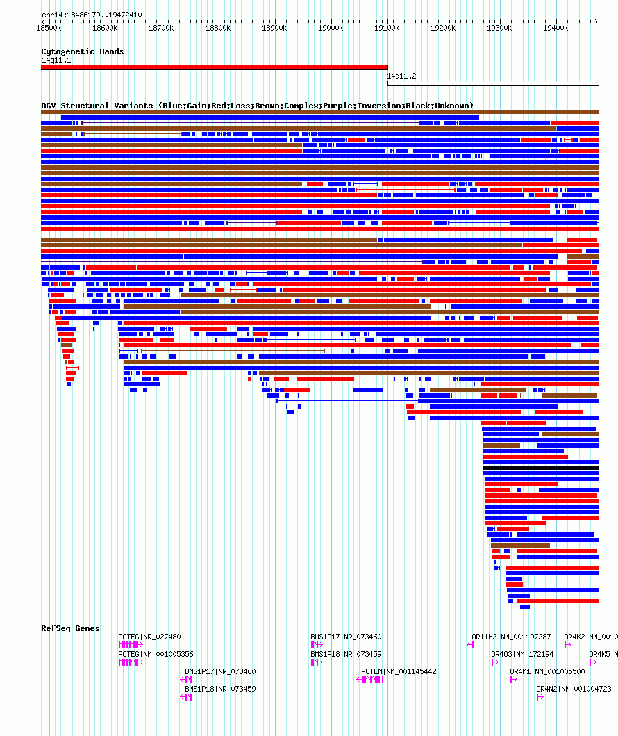 Variant DetailsVariant: nsv1036652| Internal ID | 19125871 | | Landmark | | | Location Information | | | Cytoband | 14q11.1 | | Allele length | | Assembly | Allele length | | hg38 | 1294710 | | hg19 | 986392 | | hg18 | 986232 |