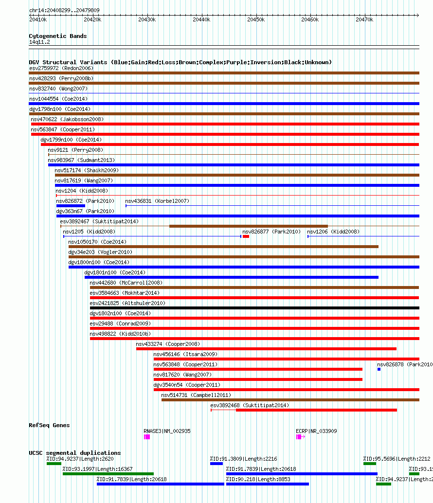 | Variant Type | CNV gain+loss | Copy Number | | Allele State | | Allele Origin | | Probe Count | | Validation Flag | | Merged Status | M | Merged Variants | dgv1798n100 | Supporting Variants | nssv3530730, nssv3530729 | Samples | | Known Genes | ECRP, RNASE3 | Method | SNP array | Analysis | Affymetrix SNP array copy number analysis | Platform | Affymetrix SNP Array 6.0 | Comments | | Reference | Coe_et_al_2014 | Pubmed ID | 25217958 | Accession Number(s) | nsv1036728