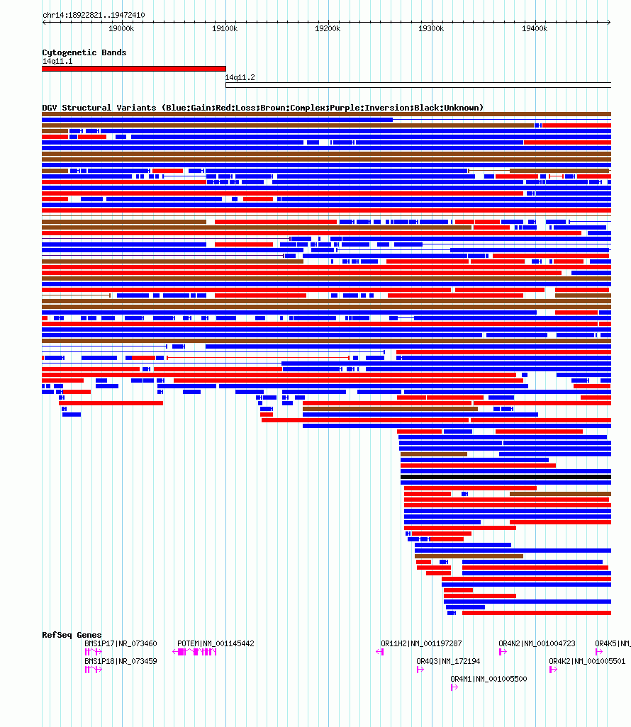 Variant DetailsVariant: nsv1036888| Internal ID | 19126107 | | Landmark | | | Location Information | | | Cytoband | 14q11.1 | | Allele length | | Assembly | Allele length | | hg38 | 669290 | | hg19 | 549750 | | hg18 | 549590 |