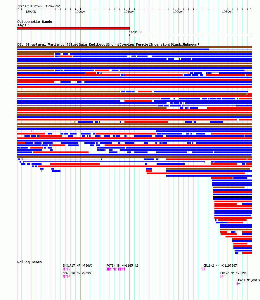 Variant DetailsVariant: nsv1036961| Internal ID | 19126180 | | Landmark | | | Location Information | | | Cytoband | 14q11.1 | | Allele length | | Assembly | Allele length | | hg38 | 578985 | | hg19 | 475564 | | hg18 | 475404 |