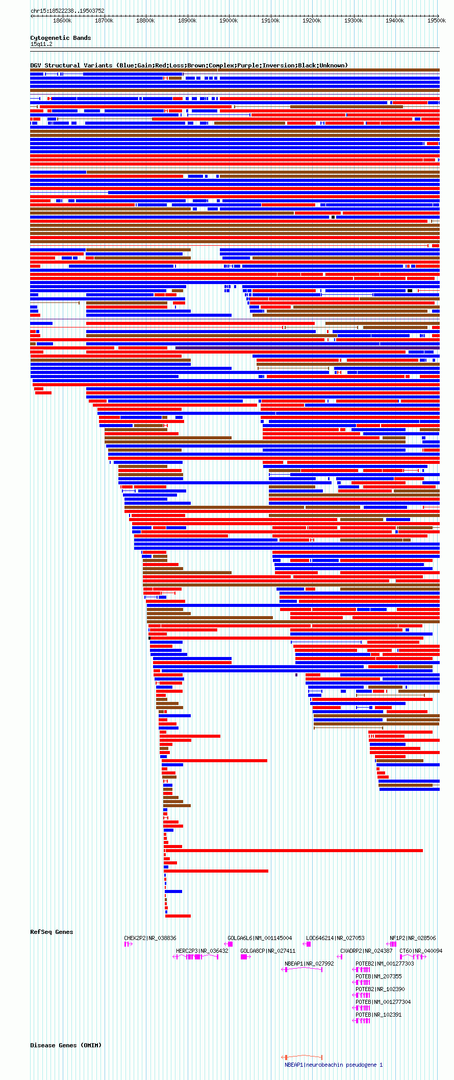 | | Variant Type | CNV gain | | Copy Number | | | Allele State | | | Allele Origin | | | Probe Count | | | Validation Flag | | | Merged Status | M | | Merged Variants | dgv2182n100 | | Supporting Variants | nssv3538390, nssv3715864 | | Samples | | | Known Genes | CHEK2P2, CT60, CXADRP2, GOLGA6L6, GOLGA8CP, HERC2P3, LOC646214, NBEAP1, NF1P2, POTEB, POTEB2 | | Method | SNP array | | Analysis | Affymetrix SNP array copy number analysis | | Platform | Affymetrix SNP Array 6.0 | | Comments | | | Reference | Coe_et_al_2014 | | Pubmed ID | 25217958 | | Accession Number(s) | nsv1036975