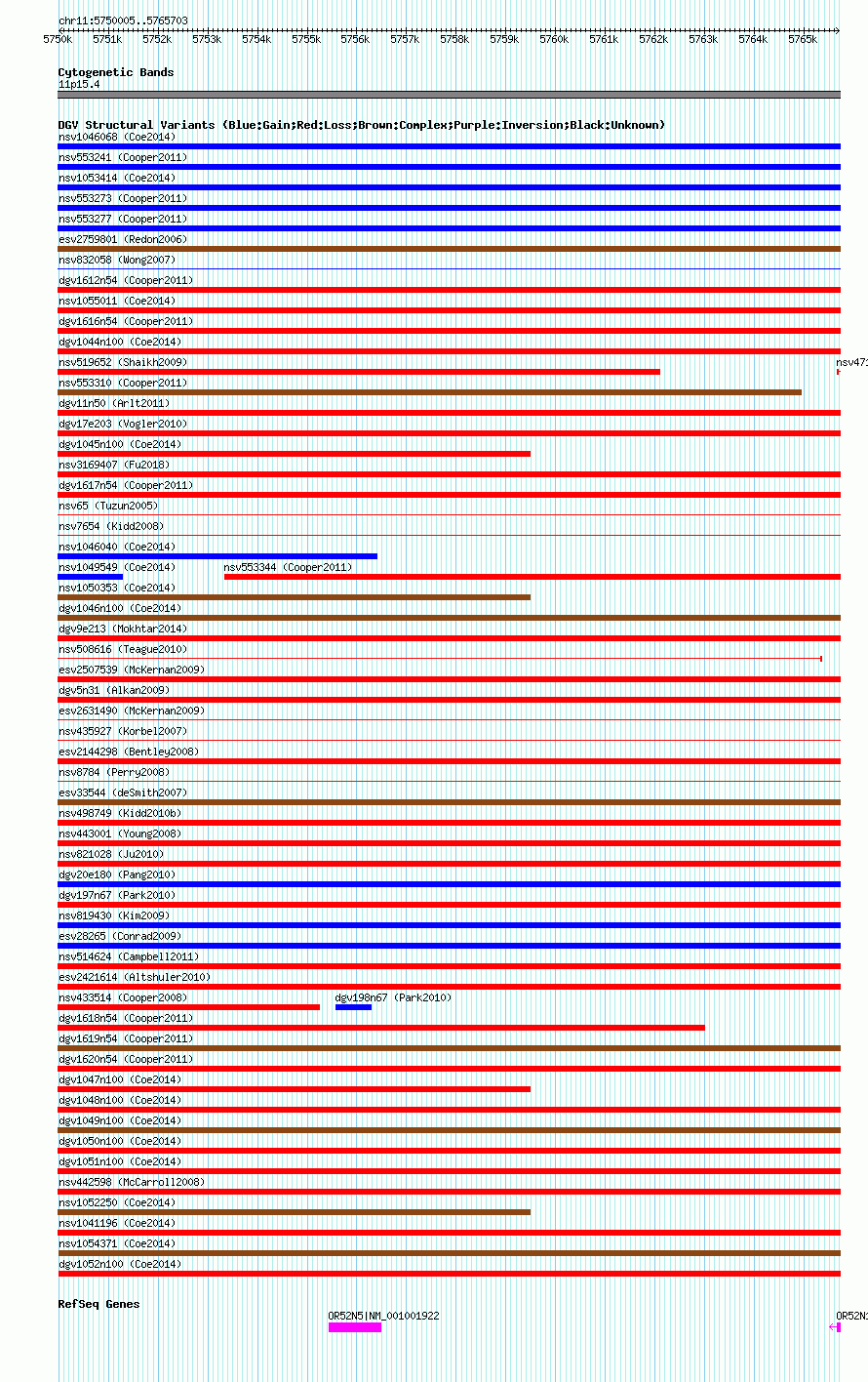 Variant DetailsVariant: nsv1036985| Internal ID | 19126204 | | Landmark | | | Location Information | | | Cytoband | 11p15.4 | | Allele length | | Assembly | Allele length | | hg38 | 15699 | | hg19 | 15699 | | hg18 | 15699 |