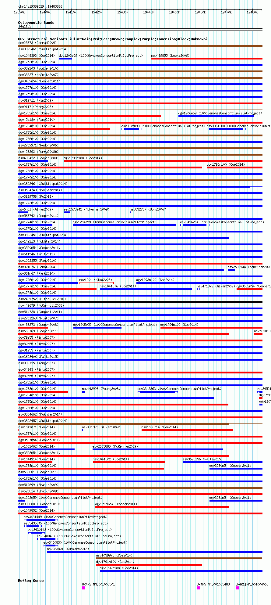 Variant DetailsVariant: nsv1037192| Internal ID | 19126411 | | Landmark | | | Location Information | | | Cytoband | 14q11.2 | | Allele length | | Assembly | Allele length | | hg38 | 94158 | | hg19 | 94158 | | hg18 | 94158 |