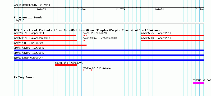 Variant DetailsVariant: nsv1037214| Internal ID | 18779745 | | Landmark | | | Location Information | | | Cytoband | 14q32.31 | | Allele length | | Assembly | Allele length | | hg38 | 48171 | | hg19 | 48171 | | hg18 | 48171 |