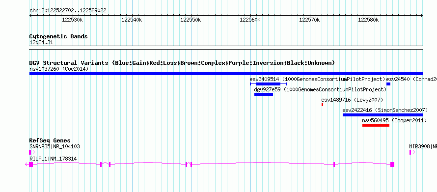 | | Variant Type | CNV gain | | Copy Number | | | Allele State | | | Allele Origin | | | Probe Count | | | Validation Flag | | | Merged Status | M | | Merged Variants | | | Supporting Variants | nssv3526096 | | Samples | | | Known Genes | MIR3908, RILPL1, SNRNP35 | | Method | SNP array | | Analysis | Affymetrix SNP array copy number analysis | | Platform | Affymetrix SNP Array 6.0 | | Comments | | | Reference | Coe_et_al_2014 | | Pubmed ID | 25217958 | | Accession Number(s) | nsv1037260