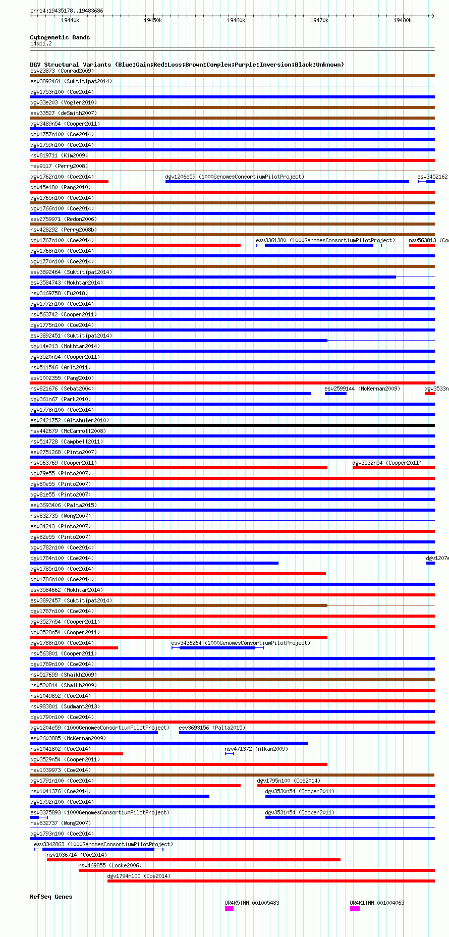 Variant DetailsVariant: nsv1037283| Internal ID | 19126502 | | Landmark | | | Location Information | | | Cytoband | 14q11.2 | | Allele length | | Assembly | Allele length | | hg38 | 48509 | | hg19 | 48509 | | hg18 | 48509 |