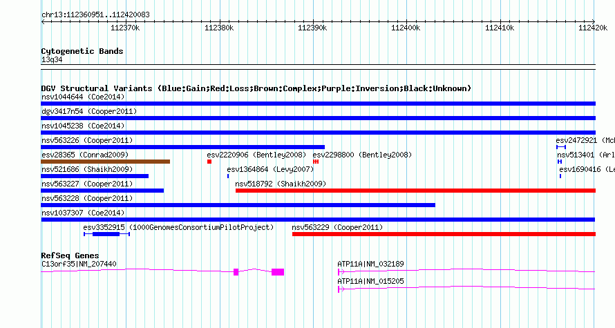 | | Variant Type | CNV gain | | Copy Number | | | Allele State | | | Allele Origin | | | Probe Count | | | Validation Flag | | | Merged Status | M | | Merged Variants | | | Supporting Variants | nssv3525615 | | Samples | | | Known Genes | ATP11A, C13orf35 | | Method | SNP array | | Analysis | Affymetrix SNP array copy number analysis | | Platform | Affymetrix SNP Array 6.0 | | Comments | | | Reference | Coe_et_al_2014 | | Pubmed ID | 25217958 | | Accession Number(s) | nsv1037307