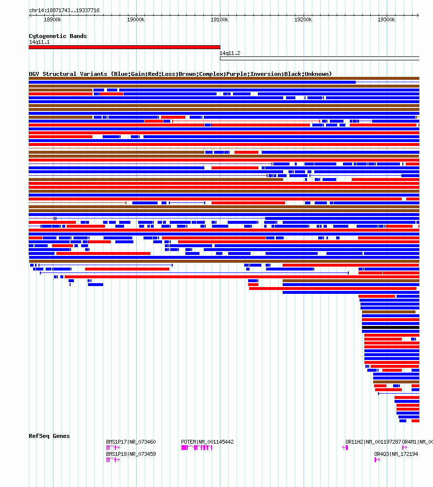 Variant DetailsVariant: nsv1037316| Internal ID | 19126535 | | Landmark | | | Location Information | | | Cytoband | 14q11.1 | | Allele length | | Assembly | Allele length | | hg38 | 568769 | | hg19 | 466134 | | hg18 | 465974 |