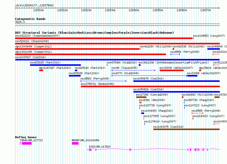 | | Variant Type | CNV gain | | Copy Number | | | Allele State | | | Allele Origin | | | Probe Count | | | Validation Flag | | | Merged Status | M | | Merged Variants | | | Supporting Variants | nssv3696511 | | Samples | | | Known Genes | EXD3, NRARP, TOR4A | | Method | SNP array | | Analysis | Affymetrix SNP array copy number analysis | | Platform | Affymetrix SNP Array 6.0 | | Comments | | | Reference | Coe_et_al_2014 | | Pubmed ID | 25217958 | | Accession Number(s) | nsv1037407