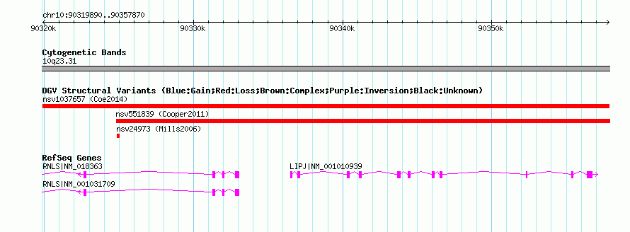 | | Variant Type | CNV loss | | Copy Number | | | Allele State | | | Allele Origin | | | Probe Count | | | Validation Flag | | | Merged Status | M | | Merged Variants | | | Supporting Variants | nssv3505213 | | Samples | | | Known Genes | LIPJ, RNLS | | Method | SNP array | | Analysis | Affymetrix SNP array copy number analysis | | Platform | Affymetrix SNP Array 6.0 | | Comments | | | Reference | Coe_et_al_2014 | | Pubmed ID | 25217958 | | Accession Number(s) | nsv1037657